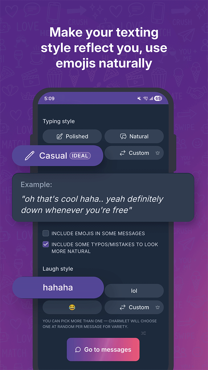 Charmlet generates natural conversational replies. You can also train the AI using your own writing examples to match your style.
