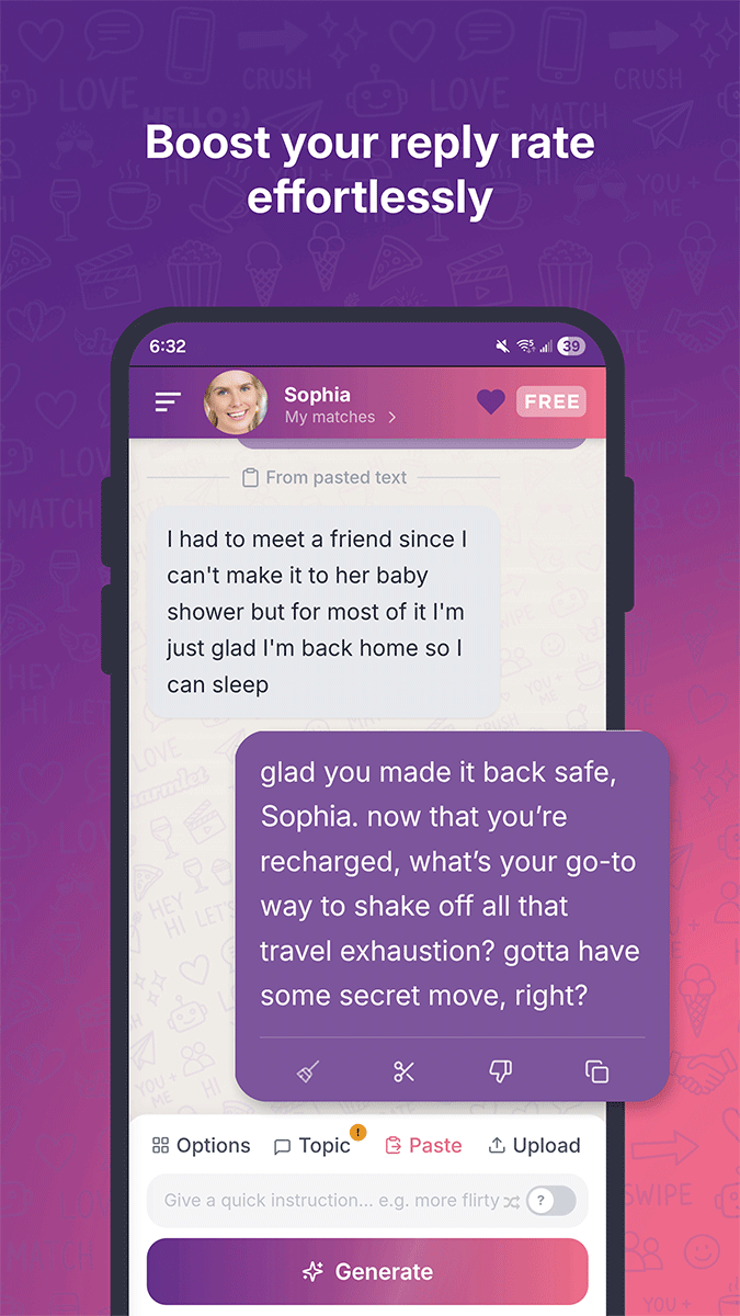 You can still fine-tune how replies sound by adjusting tone, goal, and related settings (for example warmer flirt, playful banter, or a calmer, understated line) so the vibe fits the moment while staying in a dating context.