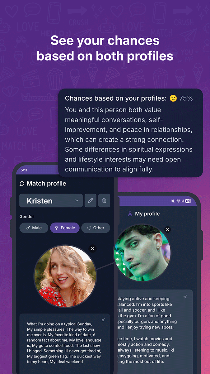 You can paste a thread into ChatGPT or Gemini, but you still have to steer the model each time: goal, tone, length, and what you did not like about the last suggestion. Charmlet wraps goal, mood, typing style, and profile or conversation context into one workflow built for quick replies and easy refinements, without rewriting long instructions every time. Contact profiles and chat history stay saved in the app, so you can come back later and generate for that same person without pasting everything again or re-explaining who they are each time.